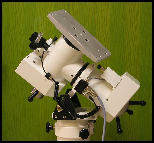 Achsenkreuz mit Schrittmotorantrieb in beiden Achsen, Edelstahlzentrierdorn zur einfachen Montage des Teleskops
